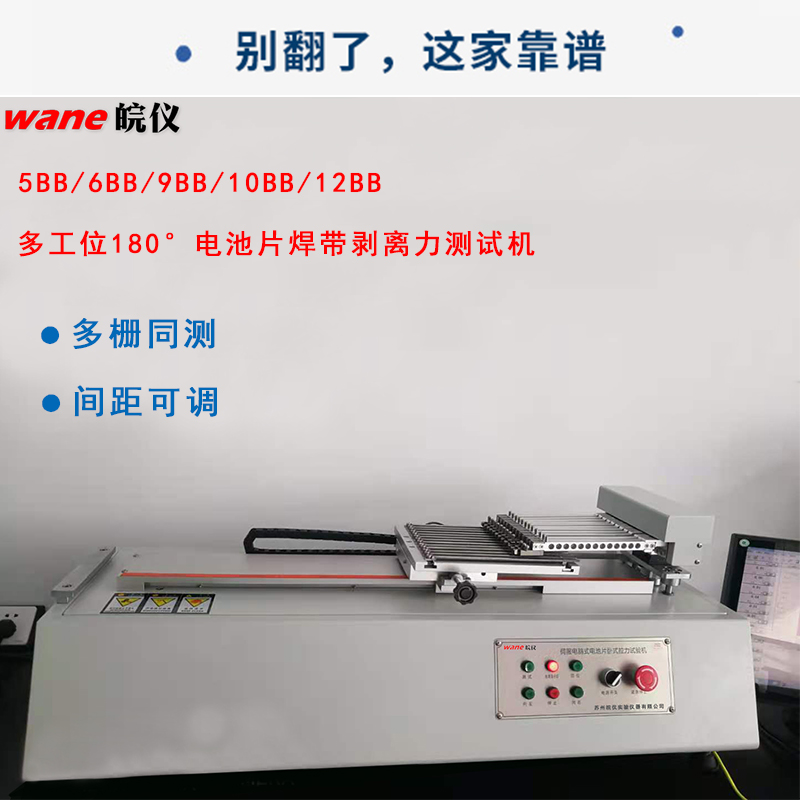 12BB電池片焊帶剝離強度試驗機兼容3BB/5BB/6BB/9BB/10BB/12BB電池片多工位多通道,兼容156mm/158.75mm/166mm/210mm/230mm等不同尺寸電池片,MBB電池片專用測試夾具可根據不同柵線間距,夾具可調,操作簡便,省時、省力。多柵同時測試,夾具端移動,傳感器測試過程中靜止不動,更好的保證測試精度。